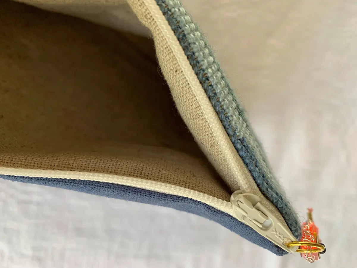 En virkelig vakker clutch med fem nydelige nyanser av plantefarget broderigarn i et  enkelt mønster inspirert av havets blåtoner. Clutchen broderes i korssting på stramai. Garn og materialer er av aller beste kvalitet.