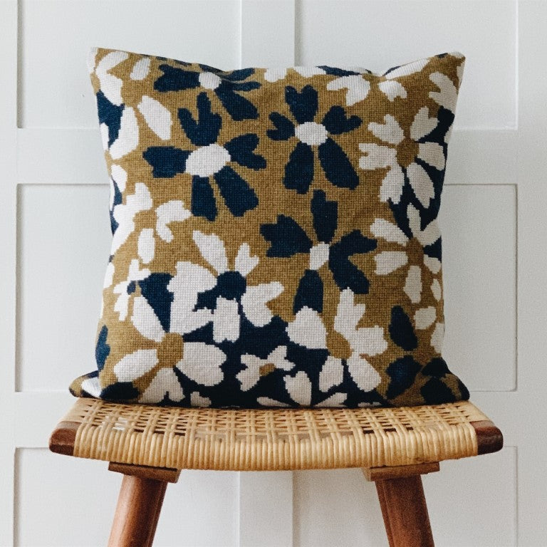 Clematis kombinerer dype blåtoner, varm oker og kremhvitt i et frodig, men samtidig stilrent mønster. Den passer like godt i en retro stue som i en moderne, lun krok.
