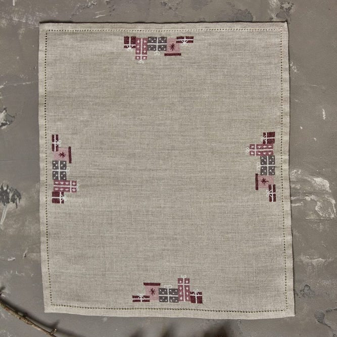 Broder din egen serviett som passer perfekt på fat med dine julekaker eller brødkurv. Gavene sys med korssting.