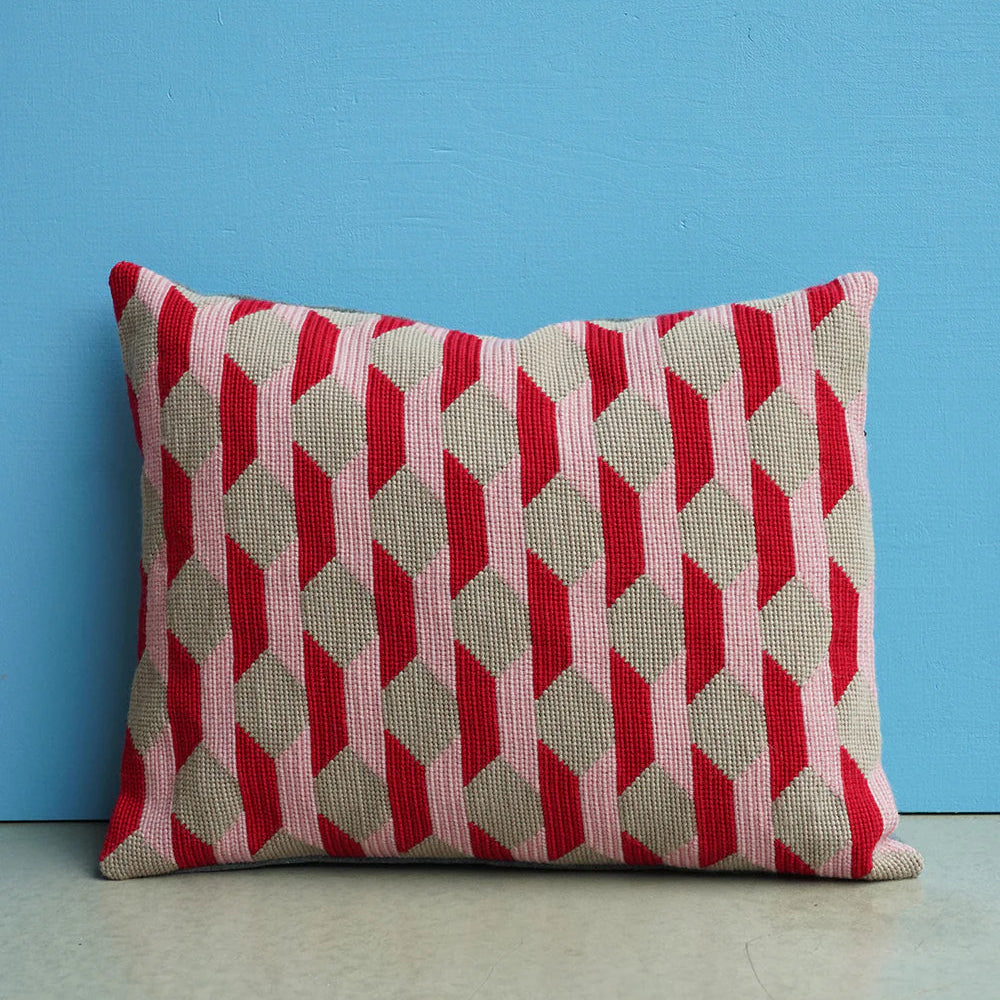 Egholm har et grafisk, tredimensjonalt mønster i tre matchende farger, designet i samarbeid med Sine Stenbek. Puten broderes med vårt ullbroderigarn i halve korssting. Stingene broderes i ulike retninger, noe som gir en vakker, vevd effekt.