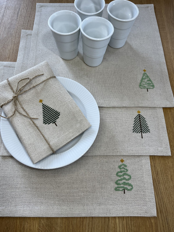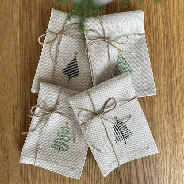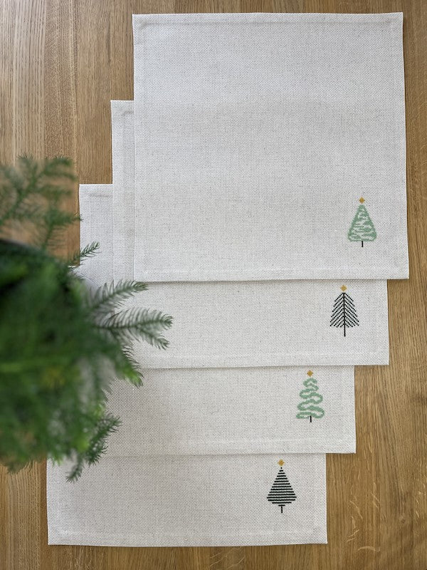 Broderikit til 4 stilige servietter med 4 forskjellige juletrær, ett på hver serviett. Her broderes det etter tellemønster med korssting.