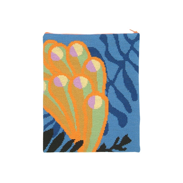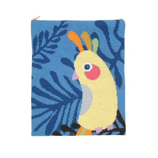 Kakaduen broderes på begge side i et langt stykke med ulikt motiv på for- og baksiden. Monteres med glidlås i toppen.