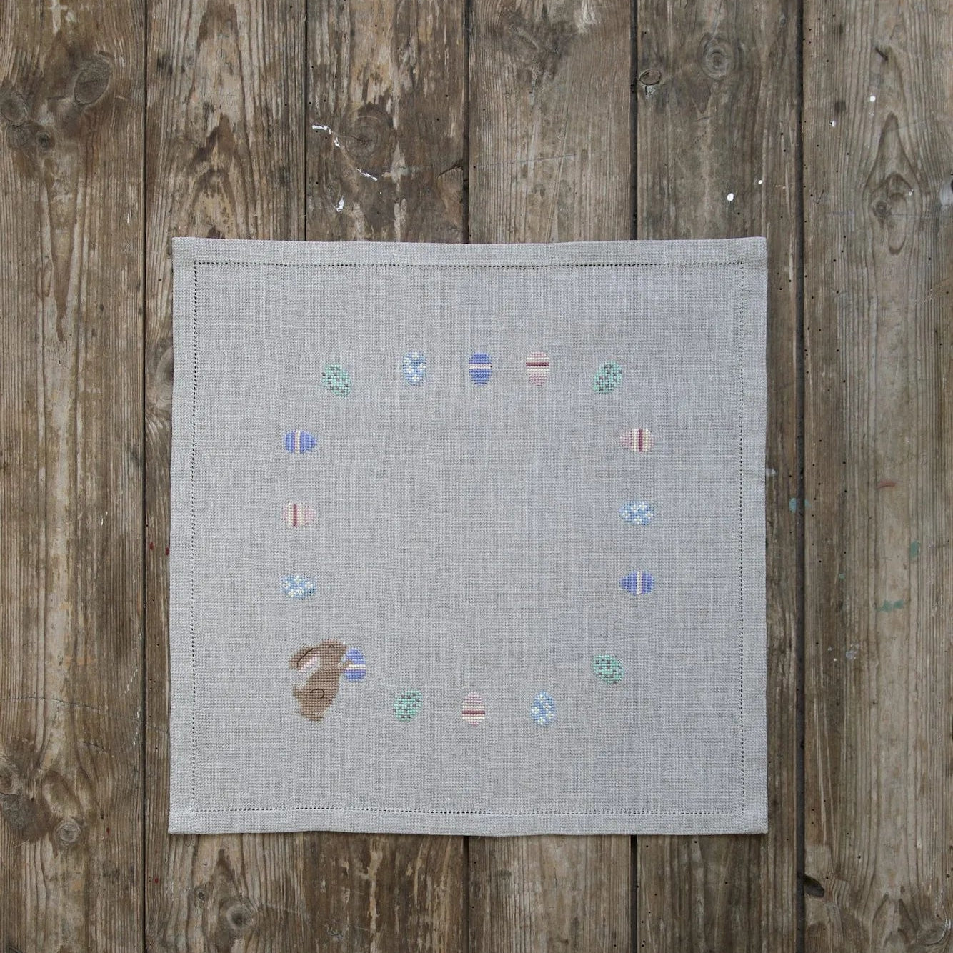 Broder din egen påskeserviett. Passer perfekt på din brødkurv eller som en flott brikke på påskebordet. Eggene og påskeharen sys med korssting.