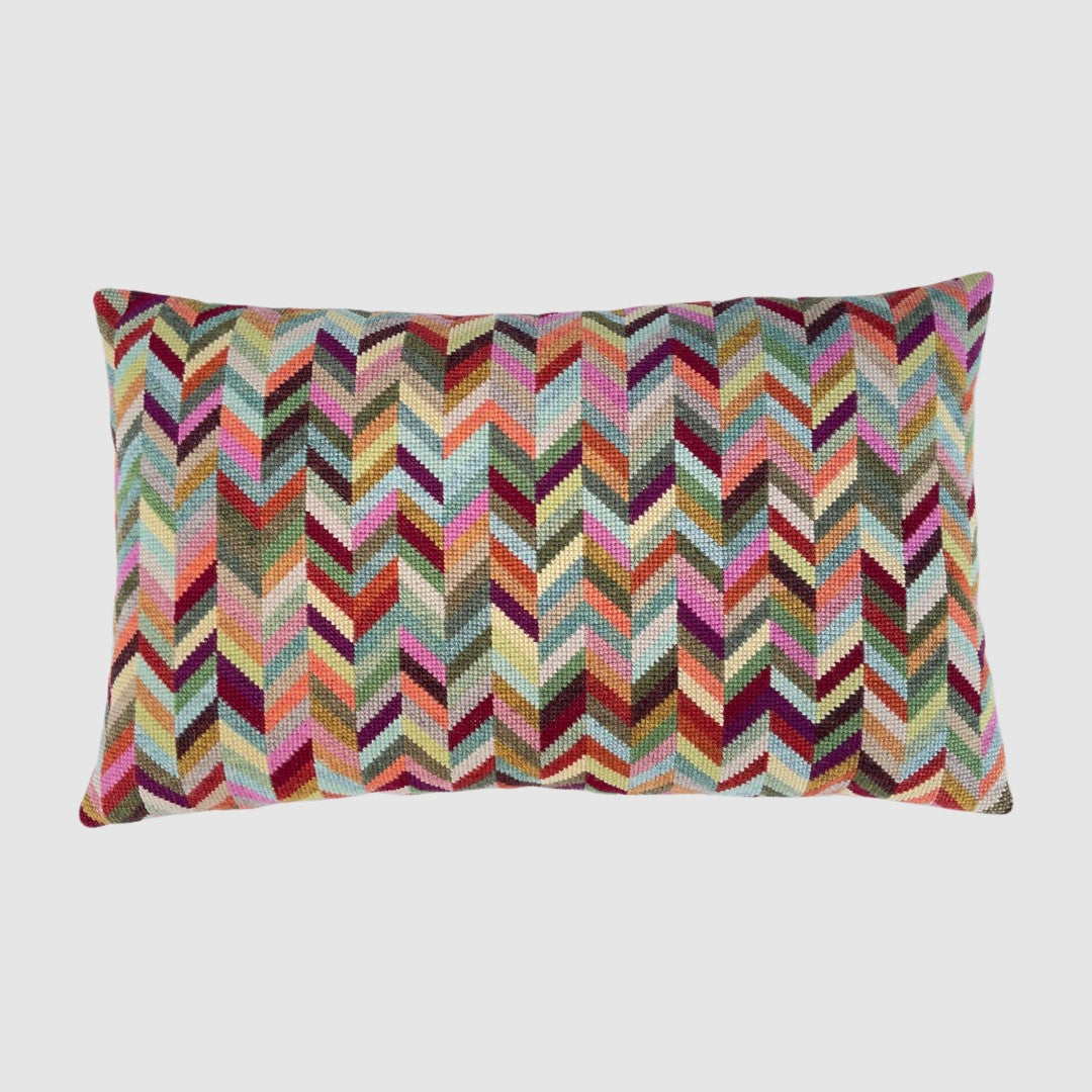 Et livlig og fargerikt mønster som leker seg i chevron-striper på kryss og tvers. Valborg puten i størrelse 50 x 30 cm bringer energi, rytme og glede inn i rommet – perfekt for deg som elsker farger og håndarbeid som gir et løft til interiøret.